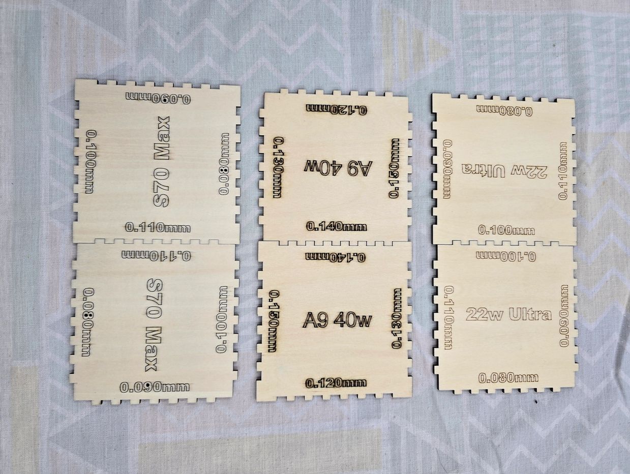 This cut test cuts a series of finger joints in .01mm increments to test the kerf of your cut. The S70 has an amazingly small spot size for a 70W laser. Almost the size of the 22w. Way smaller than the 40w